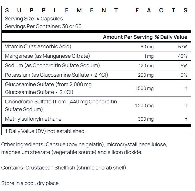 - MSM: источник органической серы, необходимой для синтеза коллагена и укрепления соединительных тканей.
